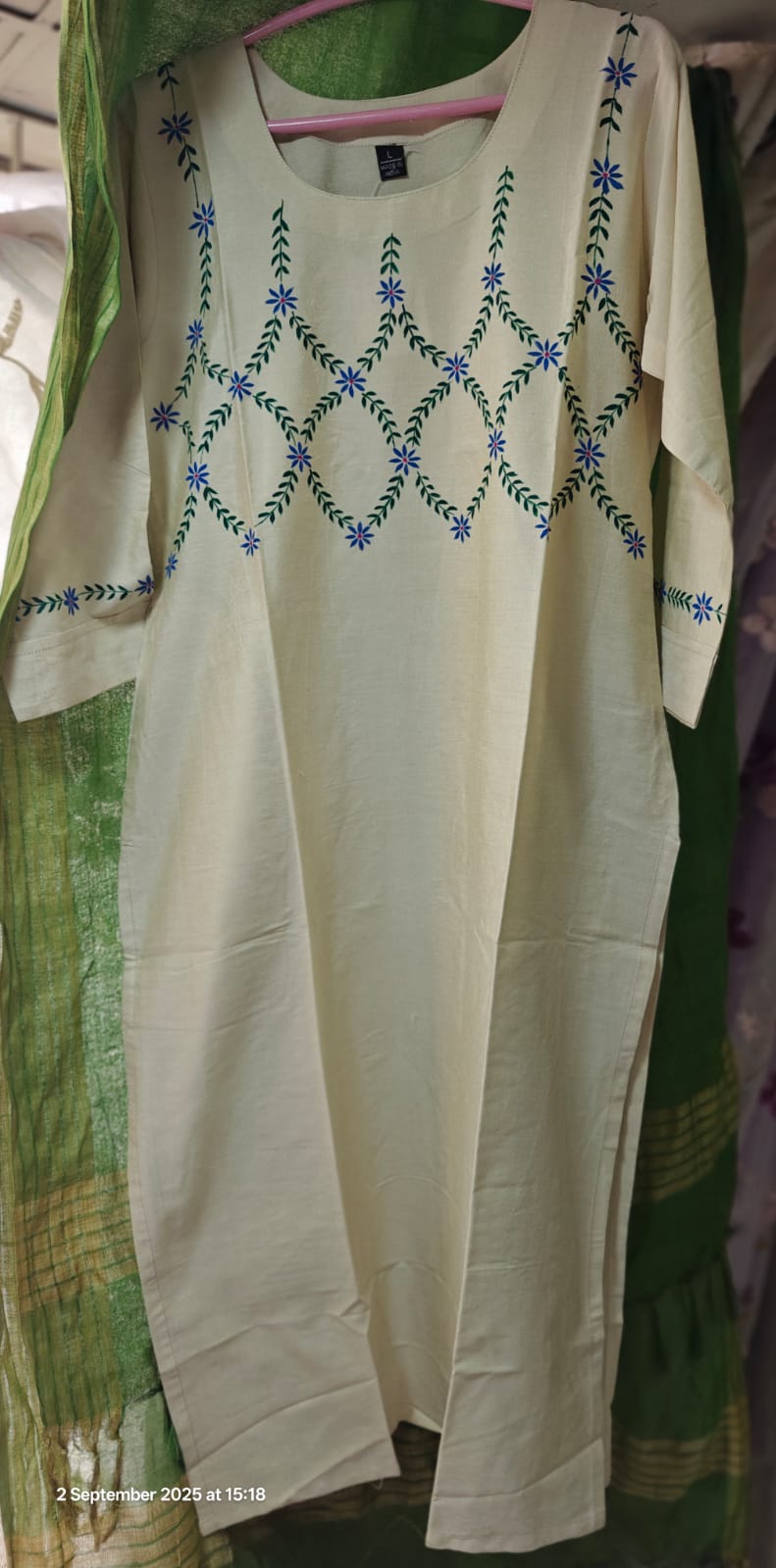 Perfect for casual outings, office wear, or festive gatherings, this kurta combines simplicity with sophistication. The straight-cut silhouette flatters all body types, while the three-quarter sleeves and round neckline ensure ease and elegance. Pair it with cotton pants or leggings for a chic, graceful look.