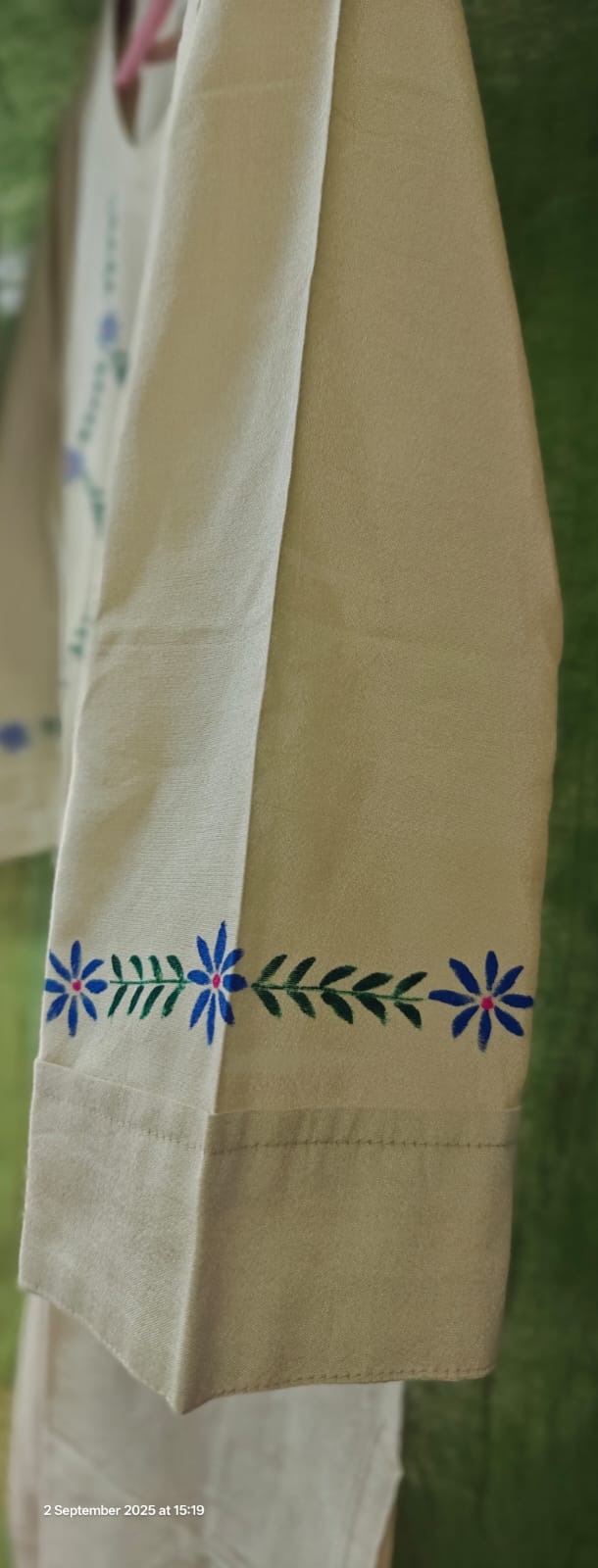 Elevate your everyday style with this elegant hand-painted cream cotton kurta, crafted with care and attention to detail. Made from soft, breathable cotton, it offers unmatched comfort while exuding timeless charm. The kurta features a delicate floral vine pattern, hand-painted in shades of blue and green, adding a refreshing touch of nature-inspired beauty. The intricate design gracefully flows across the yoke and sleeves, creating a harmonious blend of tradition and artistry.