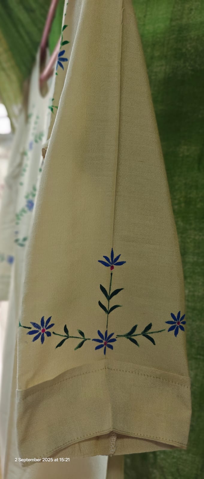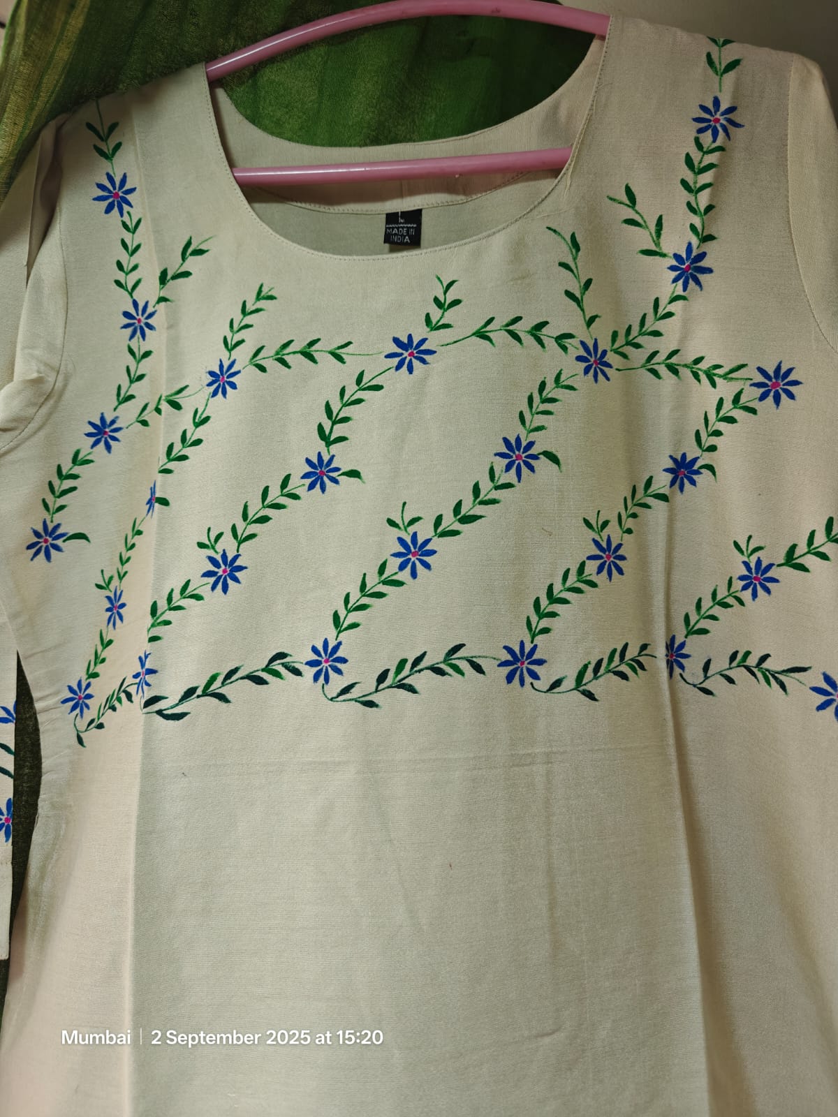 Elevate your everyday style with this elegant hand-painted cream cotton kurta, crafted with care and attention to detail. Made from soft, breathable cotton, it offers unmatched comfort while exuding timeless charm. The kurta features a delicate floral vine pattern, hand-painted in shades of blue and green, adding a refreshing touch of nature-inspired beauty. The intricate design gracefully flows across the yoke and sleeves, creating a harmonious blend of tradition and artistry.
