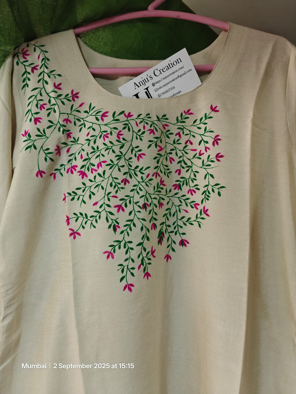 Elevate your everyday style with this elegant hand-painted cream cotton kurta, crafted with care and attention to detail. Made from soft, breathable cotton, it offers unmatched comfort while exuding timeless charm. The kurta features a delicate floral vine pattern, hand-painted in shades of blue and green, adding a refreshing touch of nature-inspired beauty. The intricate design gracefully flows across the yoke and sleeves, creating a harmonious blend of tradition and artistry.